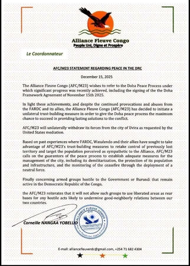Par conséquent, l’AFC/M23 a annoncé son retrait unilatéral de la ville d’Uvira, à la demande des États-Unis, médiateurs de l’Accord de paix de Washington (RDC–Rwanda).